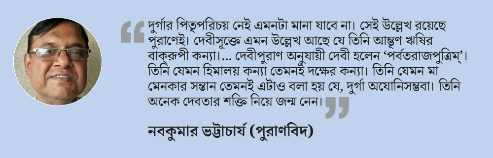 নবকুমার বলেন, “দিলীপবাবু কী বলেছেন জানি না তবে দুর্গার পিতৃপরিচয় নেই এমনটা মানা যাবে না। সেই উল্লেখ রয়েছে পুরাণেই। ঋগ্বেদের দেবীসূক্তে এমন উল্লেখ আছে যে তিনি আম্ভৃণ ঋষির বাক্রূপী কন্যা।” একই সঙ্গে নবকুমার একটি দুর্গাস্তোত্র উল্লেখ করে বলেন, দেবীপুরাণ অনুযায়ী দেবী হলেন ‘পর্বতরাজপুত্রিম্’। নবকুমার বলেন, “তবে এটাও ঠিক যে দুর্গার পিতৃপরিচয় নানা রকম পাওয়া যায়। তিনি যেমন হিমালয় কন্যা তেমনই দক্ষের কন্যা। তিনি যেমন মা মেনকার সন্তান তেমনই এটাও বলা হয় যে, দুর্গা অযোনিসম্ভবা। তিনি অনেক দেবতার শক্তি নিয়ে জন্ম নেন।”