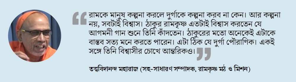 একই প্রশ্ন নিয়ে আমরা যোগাযোগ করি রামকৃষ্ণ মঠ ও মিশনের সাধারণ সম্পাদক সুবীরানন্দ মহারাজের কাছে। তিনি জানান, এই ব্যাপারে ভাল বলতে পারবেন তত্ত্ববিদানন্দ মহারাজ। পরে তত্ত্ববিদানন্দ বলেন, “দুর্গার বাবা হলেন হিমালয়। তিনি হিমালয় দুহিতা। মনে রাখতে হবে, যিনি পার্বতী, তিনিই দুর্গা। আগমনী গানে দুর্গা যে হিমালয় কন্যা তার ইঙ্গিত রয়েছে।” কিন্তু দিলীপের দাবি ছিল, রামচন্দ্র সত্যিই জন্ম নেওয়া ঐতিহাসিক চরিত্র আর মা দুর্গা ভক্তের কল্পনা। এই প্রসঙ্গে তত্ত্ববিদানন্দ বলেন, “রামকে মানুষ কল্পনা করলে দুর্গাকে কল্পনা করব না কেন। আর কল্পনা নয়, সবটাই বিশ্বাস। ঠাকুর রামকৃষ্ণ এতটাই বিশ্বাস করতেন যে আগমনী গান শুনে তিনি কাঁদতেন। ঠাকুরের মতো অনেকেই এটাকে বাস্তব সত্য মনে করতে পারেন। এটা ঠিক যে দুর্গা পৌরাণিক। একই সঙ্গে তিনি বিশ্বাসীর চোখে আন্তরিকও।”