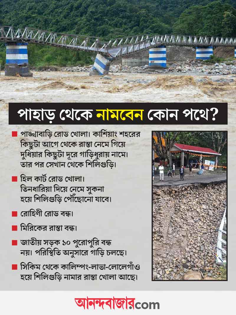 দার্জিলিং থেকে সমতলে নামার জন্য আপাতত দু’টি রাস্তা খোলা রয়েছে। হিল কার্ট রোড খোলা রয়েছে যা তিনধারিয়া হয়ে নেমে যাচ্ছে সুকনার দিকে। তার পরে সেখান থেকে রাস্তা চলে যাচ্ছে শিলিগুড়িতে। এ ছাড়া পাঙ্খাবাড়ি রোডও খোলা রয়েছে। তবে এই রাস্তাটি বেশ দুর্গম। কার্শিয়াং শহরের কিছুটা আগে থেকে রাস্তাটি নেমে যায় নীচের দিকে। তার পরে দুধিয়ার কিছু দূরে গাড়িধুরায় গিয়ে মেশে রাস্তাটি। সেখান থেকে চলে যায় শিলিগুড়িতে। দার্জিলিঙের বিজনবাড়িতে যে পর্যটকেরা আটকে ছিলেন, তাঁদের প্রায় সকলেই পাঙ্খাবাড়ি এবং তিনধারিয়া হয়ে সমতলে নামিয়ে আনা হয়েছে বলে প্রাথমিক ভাবে জানা যাচ্ছে।