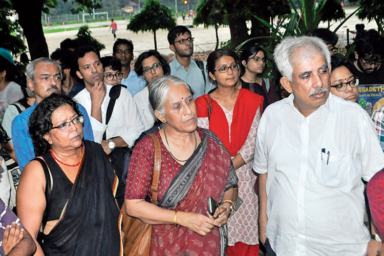 সাংবাদিকদের মুখোমুখি যাদবপুর বিশ্ববিদ্যালয়ের ইংরেজি বিভাগের শিক্ষক-শিক্ষিকারা। মঙ্গলবার। নিজস্ব চিত্র