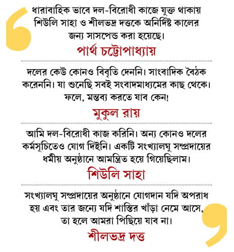 অনুগামীদের শাস্তি দিয়ে তৃণমূল নেত্রী মুকুলের পথে কাঁটা বেছানোর চেষ্টা করলেও শিউলি-শীলভদ্রেরা পাল্টা প্রশ্ন তুলেছেন। এমনিতেই তৃণমূলে সাসপেনশনের চিঠি পাওয়ার নজির বিরল! তাঁরা দু’জনও সাসপেনশনের খবর জেনেছেন সংবাদমাধ্যমের কাছ থেকে। তবে দু’জনেই স্পষ্ট বলেছেন, ‘‘সংখ্যালঘু সম্প্রদায়ের অনুষ্ঠানে যোগদান যদি অপরাধ হয়ে থাকে এবং তার জন্যে যদি আমাদের উপর শাস্তির খাঁড়া নেমে আসে, তা হলে আমরা পিছিয়ে যাব না। ওই রকম ধর্মীয় অনুষ্ঠানে এক বার নয়, একশো বার, লক্ষ বার যাব!’’