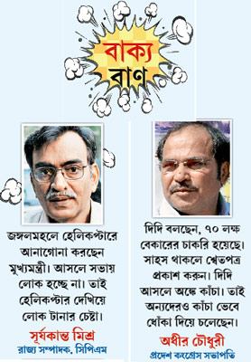 মুখ্যমন্ত্রীর নির্বাচনী প্রচারের জন্য অধীর চৌধুরীর সভার অনুমোদন বাতিলের অভিযোগ উঠল প্রশাসনের বিরুদ্ধে। মঙ্গলবার অধীরবাবুর এই দু’টি সভা হওয়ার কথা ছিল মালদহের মানিকচক এবং মোথাবাড়িতে। এর এক দিন আগে সাবিত্রী মিত্রের হয়ে মানিকচকে সভা করবেন মমতা বন্দ্যোপাধ্যায়। কংগ্রেসের অভিযোগ, তার জন্য অধীরকে পরের দিনও অনুমতি দেওয়া হয়নি। নির্বাচন কমিশনে অভিযোগ জানিয়েছেন তাঁরা। মমতার অবশ্য সভা করার কথা ছিল হবিবপুরে। দলের অন্দরের খবর, সেই কেন্দ্রে তৃণমূলের জয়ের আশা কম। তাই সেখানে সময় নষ্ট না করে সর্বশক্তি দিয়ে সাবিত্রীদেবীর পাশে দাঁড়াতে চান দলনেত্রী।