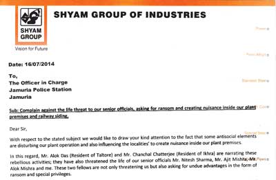 জামুড়িয়া থানায় জমা দেওয়া সংস্থার অভিযোগপত্র।
