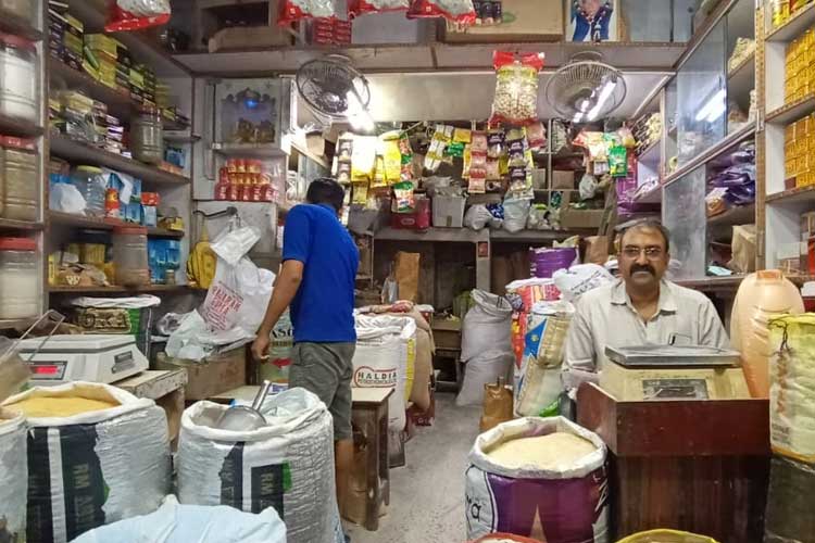 জানবাজারে মুদিখানার দোকানে আইন মেনেই প্লাস্টিক ব্যবহার করা হচ্ছে। —নিজস্ব চিত্র।