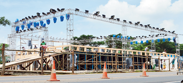 তৈরি র্যাম্প, মঞ্চ ঘিরে লাগানো হয়েছে সারি সারি আলো। ছবি: দীপঙ্কর দে