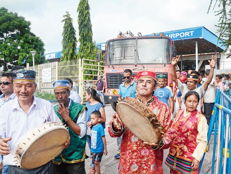 অভ্যর্থনা: মুখ্যমন্ত্রীকে স্বাগত জানাতে আসা পাহাড়ের নানা সম্প্রদায়ের প্রতিনিধিরা। সোমবার বাগডোগরায়। নিজস্ব চিত্র