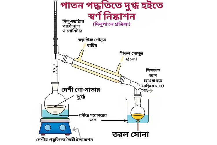 রসায়ন বইয়ের ছবির অনুকরণে আর এক নেটিজ়েন তৈরি করেছেন ‘পাতন পদ্ধতিতে দুগ্ধ হইতে স্বর্ণ নিষ্কাশন’-এর ‘ফ্লো-চার্ট’। বন্ধনীর মধ্যে উল্লেখও করে দিয়েছেন— ‘দিলুপাতন প্রক্রিয়া’! ছট পুজোয় তালা ভেঙে পুণ্যার্থীরা ঢুকে পড়েছিলেন দক্ষিণ কলকাতার রবীন্দ্র সরোবরে। সেই রবীন্দ্র সরোবরের জল দিয়ে ‘ডবল বয়লার’ তৈরি করে, তাতে ‘দিশি গরুর’ দুধ ফুটিয়ে তার সঙ্গে গোমূত্র যোগ করে কী ভাবে তরল সোনা ‘তৈরি’ করা যায়, তার সবিস্তার ছবি বানানো হয়েছে। সোনা তৈরির এই প্রক্রিয়ার ‘বাইপ্রডাক্ট’ বা উপজাত যে ‘হাওয়া হয়ে বেরিয়ে যাওয়া শিক্ষাগত জ্ঞান’, তার-ও উল্লেখ করা হয়েছে এই ব্যঙ্গচিত্রে। এ ছাড়া, গরুর বাঁটে নামী গয়নার দোকানের ঠিকানা, গরুর দিকে হিংসে ভরা চোখে অসংখ্য গয়না-শোভিত বাপি লাহিড়ীর তাকিয়ে থাকা, সোনার কেল্লাকে ‘দুধের কেল্লা’ বলা, দিশি গরু বাঁধা রেখে ব্যাঙ্ক থেকে ‘গোল্ড লোন’ পাওয়ার চেষ্টা— নানা ধরনের মিম দিনভর ঘুরেছে সোশ্যাল মিডিয়ায়। সবাই স্বীকার করে নিচ্ছেন— দুধ না খেলে, হবে না ‘সোনা’ ছেলে!