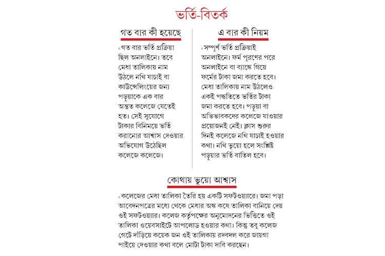 ভর্তি হবে অনলাইনে। ক্লাস শুরুর দিনই প্রথম কলেজে যাবেন ছাত্রেরা। তার আগে যাওয়ার প্রয়োজন নেই। প্রায় সমস্ত কলেজের প্রধান গেটেই এই মর্মে বিজ্ঞপ্তি টাঙানো রয়েছে। তা সত্ত্বেও বেশ কিছু কলেজের সামনে ভর্তি হতে চাওয়া পড়ুয়ার আনাগোনা চলছেই। কেন?
