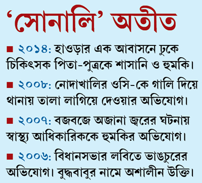প্রথমত, ডেপুটি স্পিকারের মতো সাংবিধানিক পদে থেকে রাজনৈতিক সভায় যাওয়া উচিত কি না, প্রশ্ন আছে তা নিয়েই। সোনালি অতীতের মতোই এ বারও দলীয় সভায় উপস্থিত হয়েছেন। এবং সেখানে গিয়ে যে ভাবে বিরোধী দলনেতাকে আক্রমণ করেছেন, তাতে স্তম্ভিত সব মহল! প্রশ্ন উঠে গিয়েছে দলের ভিতরে-বাইরে। বিরোধী দলের বিধায়ক থাকাকালীন নানা বিতর্কেই জড়িয়েছেন সোনালি। বিরোধীদের বক্তব্য, নোদাখালির ওসি-কে গালিগালাজ করে থানায় তালা লাগিয়ে দেওয়া, বজবজে স্বাস্থ্য আধিকারিককে হুমকি দেওয়া বা বিধানসভার লবিতে ভাঙচুরের ঘটনায় জড়িয়ে গিয়ে তৎকালীন মুখ্যমন্ত্রী বুদ্ধদেব ভট্টাচার্যের উদ্দেশে অশালীন শব্দ প্রয়োগ— এ সবেই খচিত হয়ে আছে সোনালির অতীত। ডেপুটি স্পিকার হওয়ার পরেও কয়েক মাস আগে হাওড়ার গোলাবাড়ি এলাকার এক আবাসনে ঢুকে চিকিৎসক পিতা-পুত্রকে হুমকি দেওয়ার অভিযোগ উঠেছিল তাঁর বিরুদ্ধে। কিন্তু প্রকাশ্য মঞ্চে দাঁড়িয়ে কোনও মহিলা ডেপুটি স্পিকার তাঁর রাজনৈতিক প্রতিপক্ষ শিবিরের কারও সম্পর্কে এমন বলতে পারেন, এ দিন সোনালির কথা শোনার আগে তা অনেকেরই ধারণার বাইরে ছিল!