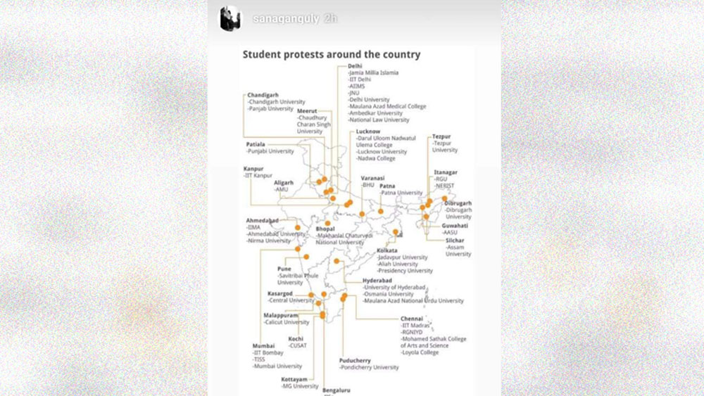 চর্চিত ‘ইনস্টাগ্রাম স্টোরি’-তে লেখক খুশবন্ত সিংহের ‘দ্য এন্ড অব ইন্ডিয়া’ বইয়ের একটি অংশ উদ্ধৃত করা ছিল। পাশাপাশি, বিভিন্ন শিক্ষা প্রতিষ্ঠানে নতুন নাগরিকত্ব আইনের বিরুদ্ধে যে আন্দোলন চলছে, সেই তথ্য সম্বলিত ভারতের একটি মানচিত্রও পোস্ট করা হয়েছিল। ‘ইনস্টাগ্রাম স্টোরি’ যদি নিজে থেকে সরিয়ে দেওয়া না হয়, তা হলে পোস্ট করার ২৪ ঘণ্টা পর্যন্ত দেখা যায়। রাতে সৌরভের টুইট আসার পরে অবশ্য পোস্টটি আর দেখা যায়নি।