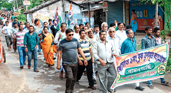 তৃণমূলের মিছিল। বুধবার বামনগাছিতে। ছবি: সুদীপ ঘোষ