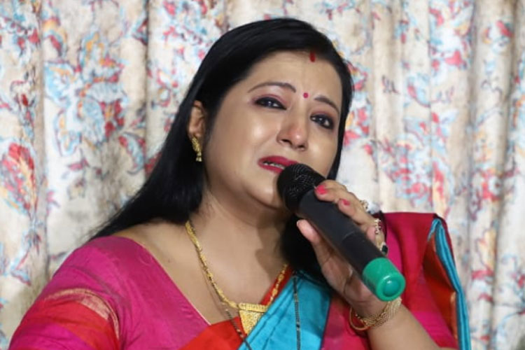 সাংবাদিক সম্মেলনে কান্নায় ভেঙে পড়লেন বৈশাখী বন্দ্যোপাধ্যায়।—নিজস্ব চিত্র।
