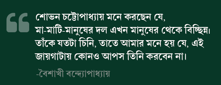 অর্থাৎ সব পথই যে খোলা রয়েছে শোভন চট্টোপাধ্যায়ের সামনে, সে কথাই লোকসভা নির্বাচনের আগের সেই সাংবাদিক বৈঠকে বুঝিয়ে দেওয়ার চেষ্টা করেছিলেন বৈশাখী। কিন্তু এ বার ইঙ্গিত বদলে গেল। আনন্দবাজারকে দেওয়া সাক্ষাৎকারে বৈশাখী বন্দ্যোপাধ্যায় অত্যন্ত তাৎপর্যপূর্ণ ভাবে বললেন, ‘‘শোভন চট্টোপাধ্যায় মনে করছেন যে, মা-মাটি-মানুষের দল এখন মানুষের থেকে বিচ্ছিন্ন। তাঁকে যতটা চিনি, তাতে আমার মনে হয় যে, এই জায়গাটায় কোনও আপস তিনি করবেন না।’’