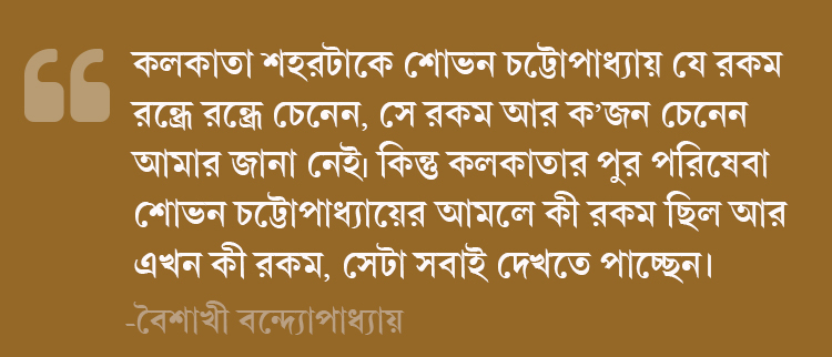 মন্ত্রিত্বে এবং মেয়র পদে ইস্তফা দেওয়ার পর থেকে শোভন চট্টোপাধ্যায় সম্পূর্ণ এড়িয়ে চলছেন সংবাদমাধ্যমকে। নিজের ভবিষ্যৎ কর্মপন্থা সম্পর্কে ঘনিষ্ঠ মহলে আলোচনা চালাচ্ছেন ঠিকই। কিন্তু প্রকাশ্যে কিছুতেই মুখ খুলছেন না। তবে তার জন্য শোভনকে ঘিরে রাজনৈতিক প্রবাহ থেমে গিয়েছে, এমন কিন্তু নয়। বরং শোভনকে ঘিরে তৃণমূল আর বিজেপির টানাপড়েন রীতিমতো আবর্ত তৈরি করেছে। সে আবর্তে শোভনের সর্বক্ষণের সঙ্গী যদি কেউ থাকেন, তা হলে তাঁর নাম বৈশাখী বন্দ্যোপাধ্যায়। বিজেপি চাইছে শোভনের সঙ্গে বৈশাখীও যোগ দিন দলে। অন্য দিকে শোভনকে ফের তৃণমূলের হয়ে ময়দানে নামাতে সেই বৈশাখীকেই বৈঠকে ডাকছেন পার্থ চট্টোপাধ্যায়। শুধু তাই নয়, গত কয়েক মাসে শোভনের তরফ থেকে যেটুকু যা রাজনৈতিক বার্তা দেওয়ার চেষ্টা হয়েছে, সে সবও প্রকাশ্যে এসেছে বৈশাখীর মাধ্যমেই। সুতরাং সুতরাং শোভনের এবং তাঁর নিজের রাজনৈতিক ভবিষ্যৎ সম্পর্কে বৈশাখীর এই মন্তব্য বিশেষ তাৎপর্যের।