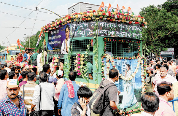 ট্রাম সাজিয়ে অভ্যর্থনা নতুন সরকারকে। শুক্রবার ধর্মতলায়। ছবি: বিশ্বনাথ বণিক