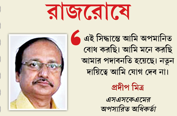 তৃণমূলের চিকিৎসক নেতা নির্মল মাজির ঘনিষ্ঠ আত্মীয়ার কুকুরের ডায়ালিসিসের জন্য এসএসকেএম-এর নেফ্রোলজি বিভাগে সব ব্যবস্থা পাকা করে ফেলেছিলেন বিভাগীয় প্রধান রাজেন পাণ্ডে। তাঁর এই উদ্যোগে অনুমোদন দিয়েছিলেন প্রদীপবাবুও। তৃণমূলের চিকিৎসক নেতাদের একাংশ বলছেন, ‘‘কুকুর-কাণ্ডে রাজ্য সরকারের যে ভাবে মুখ পুড়েছে, তাতে প্রদীপবাবুকেই বলির পাঁঠা করল স্বাস্থ্য ভবন।’’ প্রদীপবাবু অবশ্য বলেন, ‘‘এই সিদ্ধান্তে আমি অপমানিত বোধ করেছি। মনে করছি আমার পদাবনতি করা হয়েছে। নতুন দায়িত্বে আমি যোগ দেব না। স্বাস্থ্য শিক্ষা অধিকর্তাকে তা জানিয়েও দিয়েছি।’’ কুকুর কাণ্ডের সব দায় অস্বীকার করে প্রদীপবাবু দাবি করেন, বিষয়টি জানতে পেরে তিনিই ডায়ালিসিস বন্ধ করার ব্যবস্থা করেন। তিনি বলেন, বিষয়টি তাঁর অজান্তেই হচ্ছিল।