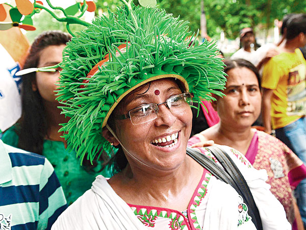 একুশের পথে এক তৃণমূল সমর্থক। ছবি: সুমন বল্লভ।