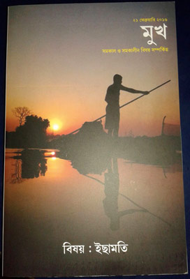 যে দেশ নদীমাত্রিক, সেই দেশেই কোনও নদী মন্ত্রক নেই। যে নদী আর্ন্তজাতিক, সেই নদীর দুর্ভোগ আরও চরমে। কূটনীতি আর রাজনীতির নাগপাশে সেই নদীকে নিয়ে অবহেলাও তীব্র। ভারত-বাংলাদেশের মধ্যে দিয়ে বহমান এমনই এক নদীর নাম, ইছামতী। সেই নদী নিয়ে কবিতা, উপন্যাস, চলচিত্র অনেক কিছুই হয়েছে, কিন্তু হয়নি নদীর যথাযথ সংস্কার। এই নদীকে আগের রূপে ফিরিয়ে দেওয়ার আর্তি নিয়েই প্রকাশিত হয়েছে ‘মুখ’ পত্রিকার ‘ইছামতী’ সংখ্যা। ২১শে ফেব্রুয়ারি বাংলাদেশের বেনাপোলে প্রকাশিত পত্রিকার এই সংখ্যাটি আদপে দুই মলাটের ভিতরে ইছামতি নদী পরিক্রমা। মাথাভাঙা হয়ে চূর্ণী নদীর শাখা হিসাবে নদিয়ার মাঝদিয়া থেকে বনগাঁ-বসিরহাটের উপর দিয়ে বয়ে চলেছে ইছামতী। এই নদীই কি বাংলাদেশের কুষ্টিয়া জেলায় শিলাইদহের কাছ দিয়ে প্রবাহিত? এই দুই ইছামতীই এক ইছামতী কি-না সে সম্পর্কে নানান কৌতূহল মেটাবে এই সংখ্যা। ‘মিলেনিয়াম বন্যা’ যা দীর্ঘদিন সংবাদপত্রের শিরোনাম হয়ে উঠেছিল তার কথাও উঠে এসেছে পত্রিকার পাতায়। বিভূতিভূষণের ইছামতি নিয়ে ভিন্ন ভাবনা নিয়ে কবি সন্দীপন চক্রবর্তীর সঙ্গে কথোপকথনও সুপাঠ্য। দীপঙ্কর দাস ও পার্থসারথিদের সম্পাদনা প্রশংসনীয়। পত্রিকা-সূচিতে তুষার কাঞ্জিলাল, কল্যাণ রুদ্র, নিত্যপ্রিয় ঘোষ, নিরঞ্জন বন্দোপাধ্যায়, বিপ্লব চন্দ, অনিল ঘোষ, টুইঙ্কিল দাঁ, বিভাস রায়চৌধুরী ছাড়াও রুকসানা কাজলের মতো বাংলাদেশের লেখকেরাও রয়েছেন।
