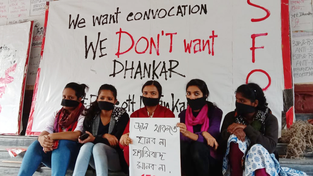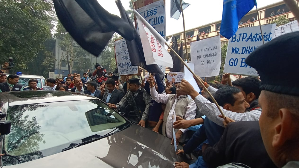 সংশোধিত নাগরিকত্ব আইন (সিএএ) এবং জাতীয় নাগরিকপঞ্জি (এনসিআর)-এর বিরুদ্ধে এ দিন দুপুরে পড়ুয়াদের প্রবল বিক্ষোভের মুখে পড়েন রাজ্যপাল। এ দিন বিশ্ববিদ্যালয়ের কোর্ট বৈঠকে যোগ দিতে গিয়ে আটকে পড়েন তিনি। বিশ্ববিদ্যালয়ে ঢুকলেও প্রথম দিকে কোর্ট বৈঠকের জন্য অরবিন্দ ভবন পর্যন্ত পৌঁছতেই পারেননি রাজ্যপাল। মূলত সংশোধিত নাগরিকত্ব আইন পাশের পরবর্তী পরিস্থিতিতে রাজ্যপালের ভূমিকা নিয়ে প্রশ্ন তুলেছেন পড়ুয়ারা। পাশাপাশি তাঁদের একাংশের আরও অভিযোগ, বিশ্ববিদ্যালয়ের স্বাধিকার ভঙ্গ করেছেন রাজ্যপাল। ফলে কোনও ভাবেই তাঁকে বিশ্ববিদ্যালয়ের কোর্ট বৈঠকের জন্য অরবিন্দ ভবনে ঢুকতে দেওয়া হবে না। তবে ওই পড়ুয়াদের সাহায্যেই শেষমেশ নিজের গাড়ি থেকে নামতে পারেন রাজ্যপাল জগদীপ ধনখড়।