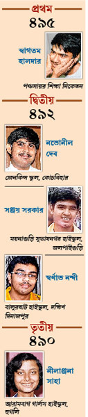 বাবা ভাদু দাস খাল-বিলে মাছ ধরে সংসার চালাতেন। পরীক্ষার দু’মাস আগে মা মারা গেলেন। পরীক্ষা চলাকালীন বাবাও আক্রান্ত হলেন পক্ষাঘাতে। কিন্তু জলপাইগুড়ির খারিজা বেরুবাড়ি হাইস্কুলের ছাত্র তাপস দাস তাতে দমে যাননি। যাবতীয় প্রতিকূলতার সঙ্গে যুদ্ধ করে কলা বিভাগে ৯২ শতাংশেরও বেশি নম্বর পেয়েছেন তিনি। স্কুলের এক শিক্ষক বলছিলেন, ‘‘জলপাইগুড়ি হাসপাতালে মাকে নিয়ে পড়ে থাকত তাপস। মাকে বাড়ি নিয়ে আসার আগের দিন হাসপাতাল থেকে খবর আসে, খাট থেকে পড়ে গিয়ে মা মারা গিয়েছেন।’’ তার পর বাবাও অসুস্থ হয়ে পড়ায় অনিশ্চিত হয়ে পড়ে পুরো ভবিষ্যতটাই। এ দিন কিন্তু আত্মীয়স্বজন, পাড়াপড়শি, স্কুলের শিক্ষকরা একবাক্যে বলছেন, ‘‘তাপস আমাদের মাথা উঁচু করে দিল।’’