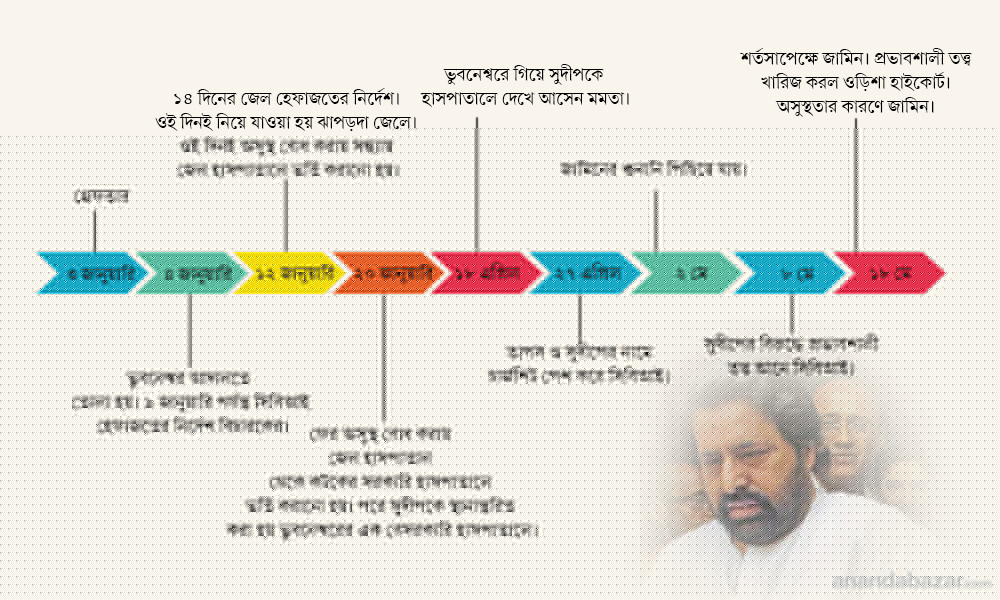 রোজ ভ্যালি কাণ্ডে গত ৩ জানুয়ারি সুদীপকে গ্রেফতার করেছিল সিবিআই। সে দিন রাতেই তাঁকে উড়িয়ে নিয়ে যাওয়া হয় ভুবনেশ্বরে। পরের দিন তাঁকে ভুবনেশ্বর আদালতে তোলা হয়। কিছু দিন সিবিআই হেফাজতে থাকার পর, জেল হেফাজতে যান সুদীপ। তার পর গত চার মাস অসুস্থতার কারণে ভুবনেশ্বরেরই এক বেসরকারি হাসপাতালে ভর্তি আছেন তিনি। ওড়িশা হাইকোর্টে জামিনের আবেদন করার সময় সুদীপের অসুস্থতার যুক্তিই সবচেয়ে সামনে আনেন তাঁর আইনজীবী। কিন্তু সিবিআই আদালতে দাবি করে, সুদীপ অসুস্থতার নাটক করছেন। সেই অভিযোগকে চ্যালেঞ্জ করে সুদীপের আইনজীবী আদালতে তাঁর সমস্ত মেডিক্যাল নথিপত্র জমা দেন। দু’পক্ষের সওয়াল জবাবের মধ্যেই সিবিআই সুদীপের বিরুদ্ধে প্রভাবশালীর তত্ত্ব খাড়া করে। বাইরে থাকলে তিনি সাক্ষীদের প্রভাবিত করার চেষ্টা করবেন বলেও আদালতে দাবি করে সিবিআই। সুদীপের জামিনে অসন্তোষ প্রকাশ করেছে সিবিআই। তদন্তকারী সংস্থাটি এই বিষয়টি নিয়ে তারা সুপ্রিম কোর্টের দ্বারস্থ হবে। সুদীপের জামিন প্রসঙ্গে সিবিআই আইনজীবী কে রাঘবাচারিলু বলেন, এই বিষয়টি নিয়ে সিবিআইকে সুপ্রিম কোর্টে যেতে বলেছি। মমতা বন্দ্যোপাধ্যায় বলেন, “সুদীপ জামিন পেয়েছেন। খুশির খবর। অনেক দিন ধরেই কষ্ট পাচ্ছিলেন। ওঁর শরীরটা একদম শেষ করে দিয়েছে। এখন ক’দিন বিশ্রাম নিক।”