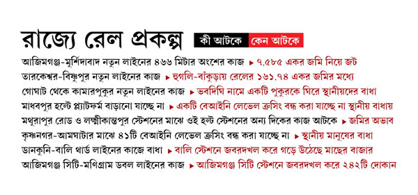 রেলের তালিকায় দেখা যাচ্ছে, ৮টি প্রকল্পের কাজ করা যাচ্ছে না হয় রেলের হাতে জমি নেই অথবা রেলের জমিতে বসে থাকা জবরদখলকারীদের সরানো যাচ্ছে না বলে। যেমন— ৭.৫৮৫ একর জমিতে রেল অধিকার কায়েম করতে ব্যর্থ হচ্ছে। ফলে, আটকে রয়েছে আজিমগঞ্জ-মুর্শিদাবাদ নতুন রেল লাইনের ৪৬৬ মিটার অংশের কাজ। হুগলি এবং বাঁকুড়ায় রেলের ১৬১.৭৪ একর জমির মধ্যে জবরদখল থাকায় তারকেশ্বর-বিষ্ণুপুর নতুন রেল লাইনের কাজ আটকে পড়েছে। ভবদিঘি নামে একটি পুকুরকে ঘিরে স্থানীয় মানুষের বাধায় গোঘাট থেকে কামারপুকুর পর্যন্ত নতুন লাইনের কাজ হচ্ছে না। স্থানীয় মানুষের বাধায় একটি বেআইনি লেভেল ক্রসিং বন্ধ করতে না পারায় মথুরাপুর রোড এবং লক্ষ্মীকান্তপুর স্টেশনের মাঝখানে মাধবপুর হল্ট স্টেশনে প্ল্যাটফর্ম বাড়ানো যাচ্ছে না। বালি স্টেশনে জবরদখল করে মাছের বাজার গড়ে ওঠায় ডানকুনি-বালি থার্ড লাইনের কাজ বাধা পাচ্ছে। আজিমগঞ্জ সিটি স্টেশনে ২৪২টা জবরদখলকারী দোকানের জন্য ব্যাহত হচ্ছে আজিমগঞ্জ সিটি-মণিগ্রাম ডবল লাইনের কাজ।