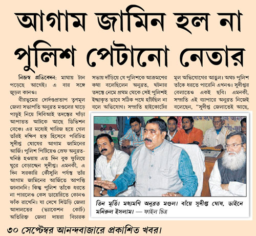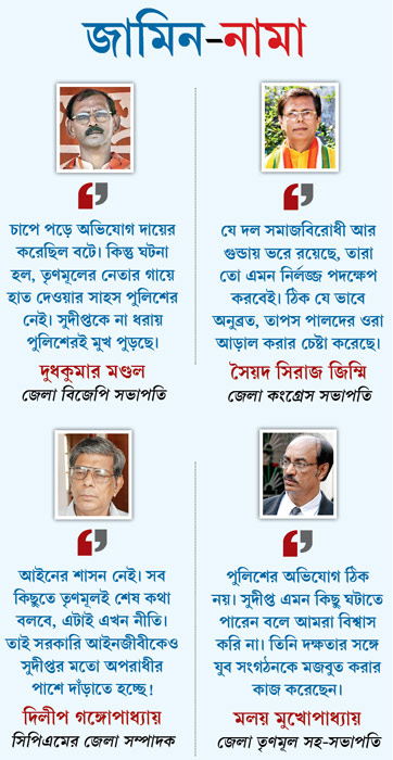 ৩ সেপ্টেম্বর রাতে বোলপুর থানায় ঢুকে এক পুলিশকর্মীকে মারধরের ঘটনায় নাম জড়ানোর পর থেকেই পর থেকেই সুদীপ্ত ঘোষকে নিয়ে বিস্তর জলঘোলা হয়েছে। তার পরেও ‘ও(সুদীপ্ত) খুব ভালো ছেলে। ও এমন করতে পারে না’ বলে নিজের অনুগামী যুবনেতাকে দরাজ সার্টিফিকেট দিয়ে ছিলেন অনুব্রত মণ্ডল। ফলে, সুদীপ্তর বিরুদ্ধে সুয়ো-মোটো (স্বঃপ্রণোদিত) মামলা রুজু করার পরেও তাঁর কেশাগ্র স্পর্শ করার ‘সাহস’ হয়নি পুলিশের। ওই ঘটনার পরেও বারবার বোলপুরে প্রকাশ্যে ঘুরে বেড়াতে দেখা গিয়েছে সুদীপ্ত এবং ঘটনায় অভিযুক্ত অন্যদের। এক জনকেও পুলিশ ধরতে পারেনি। বিরোধীদের অভিযোগ ছিল, শাসকদলের নেতা হওয়াতেই পুলিশ হাত গুটিয়ে বসে আছে। পুলিশ সুপার অলোক রাজোরিয়া নিজেই বলেছিলেন, ‘পুলিশ কঠিন সময়ের মধ্যে দিয়ে যাচ্ছে’।