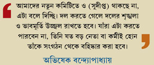 নতুন দায়িত্ব পেয়ে দলে নিজের কর্তৃত্ব প্রতিষ্ঠা করতে তৎপর অভিষেক এ দিন বলে দিয়েছেন, “দল করতে গেলে দলের শৃঙ্খলা ও ভাবমূর্তি উজ্জ্বল রাখতে হবে। যাঁরা এটা করতে পারবেন না, তিনি যত বড় নেতা বা কর্মীই হোন তাঁকে সংগঠন থেকে বহিষ্কার করা হবে। এটা সকলে যেন মনে রাখেন।” অনুব্রত-মনিরুলকে নিয়ে নানা বিতর্কের প্রেক্ষিতে এই মন্তব্য আলাদা করে ইঙ্গিতবাহী হতে পারে বলে দলের একাংশের ধারণা।