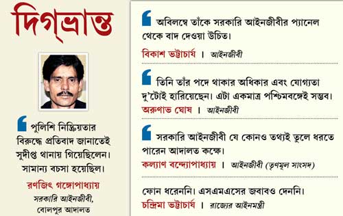 কিন্তু সরকারি আইনজীবী কি অভিযুক্তের হয়ে সওয়াল করতে পারেন? কলকাতা হাইকোর্টের আইনজীবী অসীমেশ গোস্বামী বলেন, “সরকারি আইনজীবী অভিযুক্তের বিরুদ্ধে সওয়াল করতে পারেন না। আইন ও বিচারবিভাগের উচিত তাঁর বিরুদ্ধে আইনানুগ ব্যবস্থা নেওয়া।” জেলা পুলিশের একাংশও বলছেন, “যাঁর আমাদের হয়ে বলার কথা, তিনি কী ভাবে উল্টো কাজ করলেন, আমরা বুঝতে পারছি না।” যদিও রণজিৎবাবুর দাবি, “আমি কারও হয়ে বা বিরোধিতা করে সওয়াল করিনি। আদালতের কাছে সঠিক তথ্যই তুলে ধরেছি।”