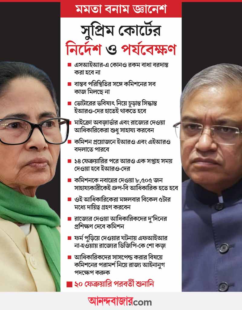 একই সঙ্গে দেশের প্রধান বিচারপতির বেঞ্চ এ-ও স্পষ্ট করে দিয়েছে যে ভোটারদের নথিপত্র যাচাইয়ের ক্ষেত্রে চূড়ান্ত সিদ্ধান্ত নেবেন ইআরও-রাই। মাইক্রো অবজ়ার্ভার এবং রাজ্যের দেওয়া আধিকারিকেরা শুধু সাহায্য করবেন। তবে আদালত এ-ও জানিয়েছে, কমিশন প্রয়োজনে ইআরও এবং এইআরও-দের বদলাতে পারবে। বস্তুত, গত বুধবারের শুনানি চলাকালীন মুখ্যমন্ত্রী মমতার মন্তব্যেও উঠে এসেছিল ইআরও-দের কাজের প্রসঙ্গ। তিনি অভিযোগ করেছিলেন, “ইআরও-দের ক্ষমতা কেড়ে নেওয়া হয়েছে।”