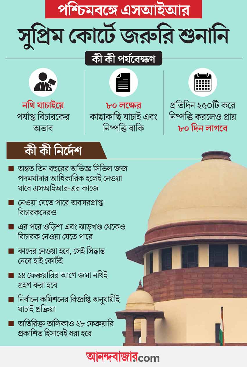 কিন্তু সুপ্রিম কোর্ট চাইছে সময়ের মধ্যেই কাজ শেষ হোক। তাই আদালত জানিয়ে দিয়েছে, এই কাজে ভিন্রাজ্য থেকেও বিচারক নেওয়া যাবে। দুই প্রতিবেশী রাজ্য ওড়িশা এবং ঝাড়খণ্ড থেকে বিচারকদের পশ্চিমবঙ্গের এসআইআর-এর কাজে আনা যাবে বলে জানান প্রধান বিচারপতি কান্ত। পাশাপাশি তিন বছর বা তার বেশি সময়ের অভিজ্ঞতাসম্পন্ন সিভিল জজ (সিনিয়র এবং জুনিয়র ডিভিশন) পদমর্যাদার অফিসারদেরও নেওয়া যাবে। কাজে নেওয়া যাবে অবসরপ্রাপ্ত বিচারকদেরও।