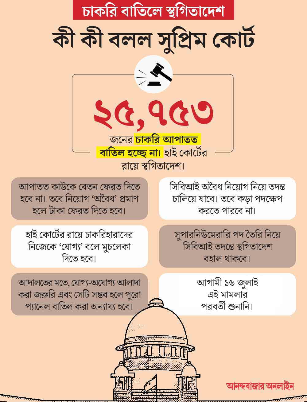 মঙ্গলবার সুপ্রিম কোর্ট জানিয়েছে, হাই কোর্টের চাকরি বাতিলের নির্দেশে স্থগিতাদেশ দিচ্ছে তারা। কেন এই নির্দেশ, তার ব্যাখ্যা করে সুপ্রিম কোর্টের প্রধান বিচারপতির বেঞ্চ বলে, ‘‘যদি যোগ্য এবং অযোগ্য আলাদা করা সম্ভব হয়, তা হলে গোটা প্যানেল বাতিল করা ন্যায্য হবে না।’’ স্থগিতাদেশ থাকবে বেতন ফেরানোর নির্দেশেও। তবে চাকরি বহাল রাখলেও এই ২৫,৭৫৩ জনকেই ‘মুচলেকা’ দিতে বলেছে সুপ্রিম কোর্ট। প্রধান বিচারপতির বেঞ্চ জানিয়েছে, এ ক্ষেত্রে পরে যাঁদের নিয়োগ ‘অবৈধ’ বলে প্রমাণ হবে, তাঁদের প্রত্যেককে টাকা ফেরত দিতে হবে।