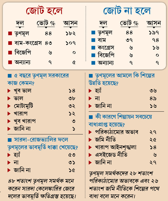 দ্বিতীয়ত, রাজ্যের ২৯৪টি বিধানসভা কেন্দ্রের মধ্যে ১০৩টিতে এই সমীক্ষা হয়েছে ২৯ জানুয়ারি থেকে ১০ ফেব্রুয়ারির মধ্যে। যখন জোট নিয়ে আলোচনা চললেও সে সম্পর্কে স্পষ্ট কোনও ধারণা তৈরি হয়নি। তখনও সিপিএম রাজ্য কমিটির বৈঠক পর্যন্ত হয়নি। ফলে মানুষ মতামত দিয়েছেন অনিশ্চিত সম্ভাবনার উপরে দাঁড়িয়ে। শেষ পর্যন্ত জোট হলে এবং ভোটের আগে পরবর্তী দু’মাসে তার পক্ষে হাওয়া উঠলে কয়েক শতাংশ ভোট এ দিক ও দিক হওয়া অসম্ভব নয় বলেই বিশ্লেষকদের মত। আর তা হলে আসনের অঙ্ক উল্টে গিয়ে রাজ্যে পাঁচ বছর আগে ঘটা পরিবর্তনের পরিবর্তন হওয়ার সম্ভাবনা উড়িয়ে দেওয়া যাচ্ছে না।