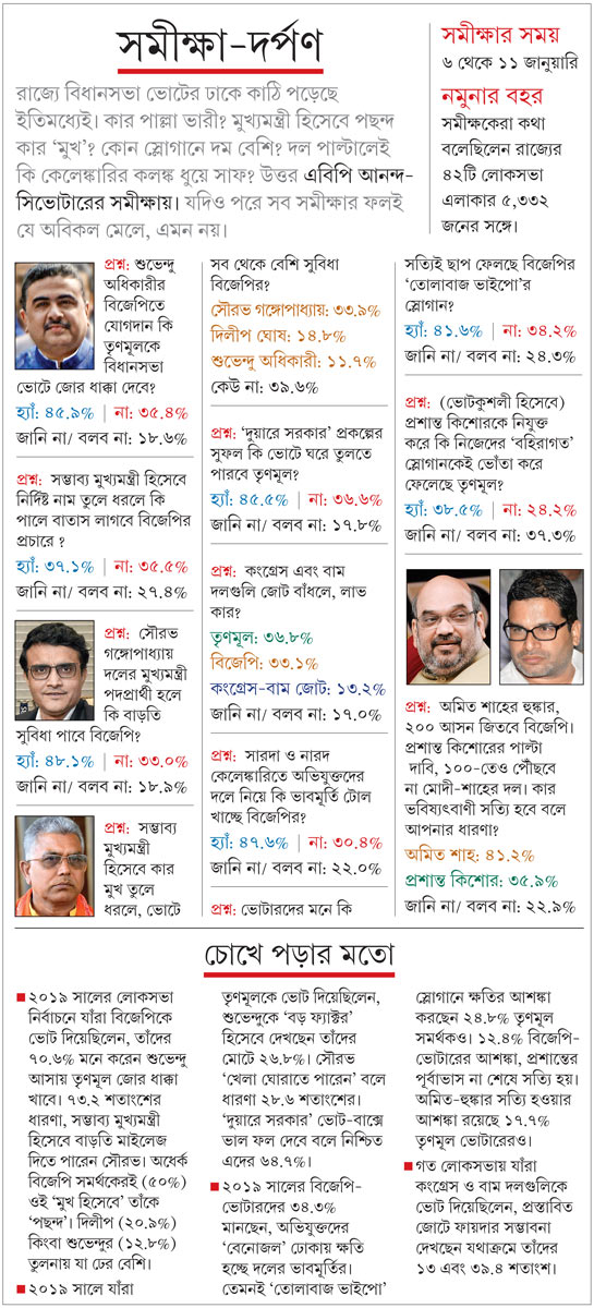 একই সময়ে রাজ্যের ৪২টি লোকসভা কেন্দ্রে ৫ হাজার ৩৩২টি নমুনার ভিত্তিতে আরও একটি সমীক্ষা করেছে সি ভোটার-এবিপি আনন্দ। সেখানে দেখা যাচ্ছে, সম্ভাব্য মুখ্যমন্ত্রী হিসেবে কোনও ‘মুখ’ না থাকা বিজেপিকে তৃণমূলের চেয়ে পিছিয়ে রাখছে। শুভেন্দু অধিকারীর বিজেপিতে যোগদান তৃণমূলের জন্য ‘জোর ধাক্কা’ বলে ৪৫.৯% উত্তরদাতা মনে করলেও মুখ্যমন্ত্রী পদের মুখ হিসেবে শুভেন্দুকে উপযুক্ত মনে করছেন ১১.৭%। দিলীপ ঘোষকে ১৪.৮%। প্রাক্তন ক্রিকেট অধিনায়ক সৌরভ গঙ্গোপাধ্যায় রাজনীতির ময়দানে এসে বিজেপির ‘মুখ’ বলে বরং কিছুটা সুবিধা পাবে গেরুয়া শিবির।