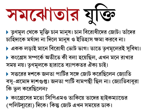 কেন তাঁরা জোট চাইছেন, ইতিমধ্যে একাধিক বার প্রকাশ্যে ও দলের অন্দরে তার ব্যাখ্যা দিয়েছেন বুদ্ধবাবুরা। প্রথমে দুর্গাপুরে রাঢ়বঙ্গের চার জেলা, তার পরে শিলিগুড়িতে উত্তরবঙ্গের ৭টি ও এ দিন কলকাতায় দক্ষিণবঙ্গের ৯টি জেলার কর্মশালায় পেশ-হওয়া নোটেও তার ইঙ্গিত ফের স্পষ্ট করা হয়েছে। বলা হয়েছে: ‘তৃণমূলী অপশাসন থেকে বাংলাকে মুক্ত করতে, গণতন্ত্র বাংলার বুকে পুনঃপ্রতিষ্ঠা ও রাজ্যের অর্থনৈতিক বিপর্যয়কে রুখতে অঙ্গীকারবদ্ধ সিপিএম ও বামফ্রন্টের শরিক দলসমূহ। এই সংগ্রামে যারা যুক্ত হতে ইচ্ছুক, তাদের সকলকে ঐক্যবদ্ধ করেই অগ্রসর হতে হবে’। অর্থাৎ নাম না করেও কংগ্রেসকে সঙ্গে নেওয়ার তাগিদ পরিষ্কার! ওই নোটে আরও আহ্বান, ‘জনগণের সংগ্রামী জোটকে আরও শক্তিশালী করাই আসন্ন বিধানসভা নির্বাচনে আমাদের সামনে চ্যালেঞ্জ। তাই বামফ্রন্টের অন্তর্ভুক্ত দলগুলি ও বাইরে অবস্থানকারী বামপন্থীরা ছাড়াও আরও বেশি মানুষকে সামিল করেই এই নির্বাচনী সংগ্রামে অবতীর্ণ হচ্ছি আমরা’।