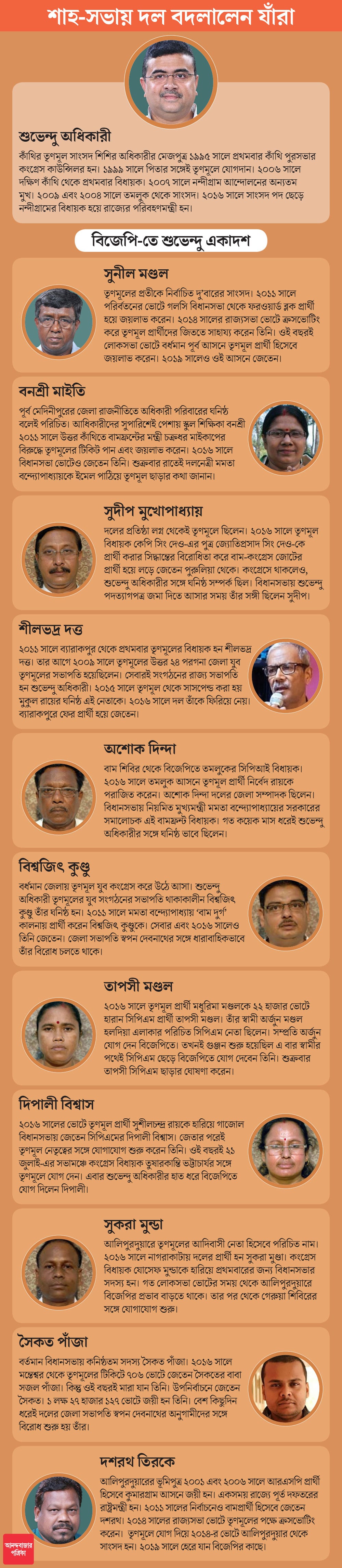 শনিবার শুভেন্দুর সঙ্গেই বিজেপিতে যোগ দিয়েছেন পূর্ব মেদিনীপুরের জেলা রাজনীতিতে অধিকারী পরিবারের ঘনিষ্ঠ বলে পরিচিত বনশ্রী মাইতি। তা ছাড়াও দল বদলেছেন রাজ্যের শাসক এবং বিরোধী শিবিরের একাধিক নেতা। তৃণমূল ছেড়ে বিজেপি-তে গিয়েছেন বর্ধমান পূর্বের সাংসদ সুনীল মণ্ডল। শুভেন্দুর হাত ধরেই বিজেপি-তে গিয়েছেন সুদীপ মুখোপাধ্যায়। বিধানসভায় পদত্যাগপত্র জমা দেওয়ার সময় শুভেন্দুর সঙ্গী ছিলেন সুদীপ। তৃণমূল থেকে বিজেপিতে গিয়েছেন শীলভদ্র দত্ত, কালনার বিধায়ক বিশ্বজিৎ কুন্ডু, মন্তেশ্বরের বিধায়ক সৈকত পাঁজা। তমলুকের সিপিআই বিধায়ক অশোক দিন্দা। স্বামী অর্জুন মণ্ডলের পথ অনুসরণ করে বিজেপিতে যোগ দিয়েছেন হলদিয়ার সিপিএম বিধায়ক তাপসী মণ্ডল। উত্তরের দুই নেতা, আলিপুরদুয়ারের দশরথ তিরকে এবং সুকরা মুন্ডাও তৃণমূল ছে়ড়ে শনিবার বিজেপি-তে যোগ দিয়েছেন।