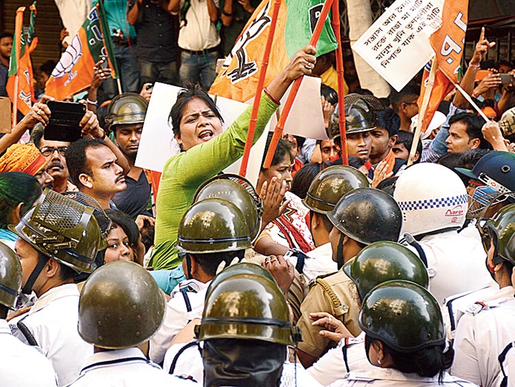 বিক্ষোভ: বিজেপির আইন অমান্য আন্দোলন। গণেশ চন্দ্র অ্যাভিনিউয়ে। বুধবার। নিজস্ব চিত্র।