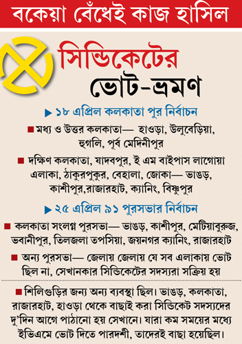 হাওড়ার গোলাবাড়ি এলাকার আর এক সিন্ডিকেট সদস্যের দাবি, ‘‘কলকাতা পুরসভার ভোটে মূলত বহিরাগতেরাই বুথের ভিতরে গিয়ে ছাপ্পা দিয়েছে। আর এলাকার সিন্ডিকেটের সদস্যেরা বুথের বাইরের পরিস্থিতি সামলেছে।’’ গত ১৮ এপ্রিল কলকাতা পুরসভা ভোটের দিনসাতেক আগেই হাওড়া, হুগলি, পূর্ব মেদিনীপুর, ভাঙড়, রাজারহাট, বিষ্ণুপুর এলাকার বহিরাগতেরা বিভিন্ন ওয়ার্ড এলাকায় ছড়িয়ে পড়েছিল। পুলিশ এবং স্থানীয় সূত্রের খবর, এলাকার সিন্ডিকেট সদস্যদের আস্তানায় ডেরা বেঁধেছিল বহিরাগতেরা। ভোট শেষ হওয়ার পরেই এলাকা ছেড়ে চলে যায় তারা। একই ভাবে ২৫ এপ্রিল অন্যান্য জেলার পুরসভা নির্বাচনে কলকাতার সিন্ডিকেটের সদস্যেরা ‘ভোট করতে’ গিয়েছিলেন নানা এলাকায়। সকলের ক্ষেত্রেই কয়েক মাস আগে থেকে সিন্ডিকেটের সব বকেয়া বন্ধ করে রাখা হয়েছিল!