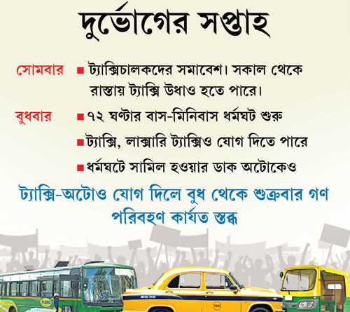 এমতাবস্থায় ২০ অগস্ট থেকে বাহাত্তর ঘণ্টা ধর্মঘটের জোরদার প্রস্তুতি শুরু করেছে বাস-মিনিবাস মালিকদের বিভিন্ন সংগঠন। বেসরকারি অন্যান্য পরিবহণ মাধ্যমকেও আহ্বান জানানো হয়েছে। এ নিয়ে লাক্সারি ট্যাক্সি সংগঠনের তরফে আজ বা কাল সিদ্ধান্ত ঘোষণার সম্ভাবনা। সাধারণ ট্যাক্সি ও অটোর সঙ্গে কথা শুরু হয়েছে। “আমরাও এ বার সুর চড়াব। যাতে সরকার একটা কিছু সিদ্ধান্তে পৌঁছতে বাধ্য হয়।” বলছেন বাস-মালিক সংগঠনের এক নেতা।