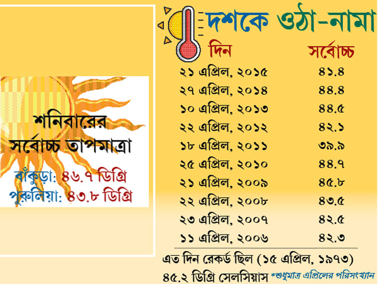 আবহাওয়া দফতরের নথি বলছে, গত বছর পর্যন্ত এপ্রিল মাসে বাঁকুড়ার সর্বোচ্চ তাপমাত্রা উঠেছিল ৪৫.২ ডিগ্রি সেলসিয়াস। ১৯৭৩ সালের ১৫ এপ্রিল সর্বকালীন রেকর্ড তাপমাত্রা উঠেছিল ৪৫.২ ডিগ্রি। এ বছর এপ্রিলের গোড়াতেই ৪৬ ডিগ্রি সেলসিয়াসে উঠে সেই রেকর্ড ভেঙে দিয়েছিল বাঁকুড়া। গত কয়েক দিন ধরে ৪৬ ডিগ্রির কোঠায় ঘোরাফেরা করছিল। দশমিকের ভগ্নাংশের হিসেবে এ দিন নতুন রেকর্ড গড়েছে সে।