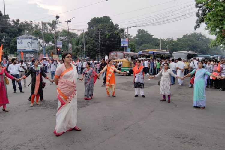 মানববন্ধন করে রাস্তা অবরোধ এবিভিপি কর্মীদের। ছিলেন মুকুল রায়, লকেট চট্টোপাধ্যায়, জয়প্রকাশ মজুমদারদের মতো বিজেপি নেতারাও।