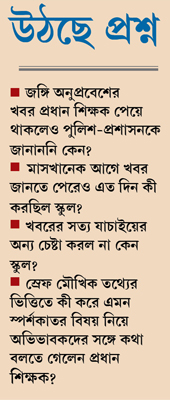 কিন্তু প্রশ্ন হল, জঙ্গি অনুপ্রবেশের খবর তিনি পেয়ে থাকলেও পুলিশ-প্রশাসনকে জানাননি কেন? মাসখানেক আগে খবর জানতে পেরেও এত দিন কী করছিলেন? খবরের সত্য যাচাইয়ের অন্য চেষ্টা করলেন না কেন? স্রেফ মৌখিক তথ্যের ভিত্তিতে কী করে এমন স্পর্শকাতর বিষয় নিয়ে অভিভাবকদের সঙ্গে কথা বলতে গেলেন?