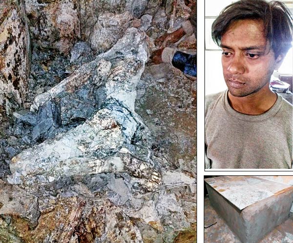 বেদি ভাঙতেই উদ্ধার নরকঙ্কাল (বাঁ দিকে)। আকাঙ্ক্ষার দেহ চাপা বেদি (নীচে)। ধৃত উদয়ন দাস (উপরে)।