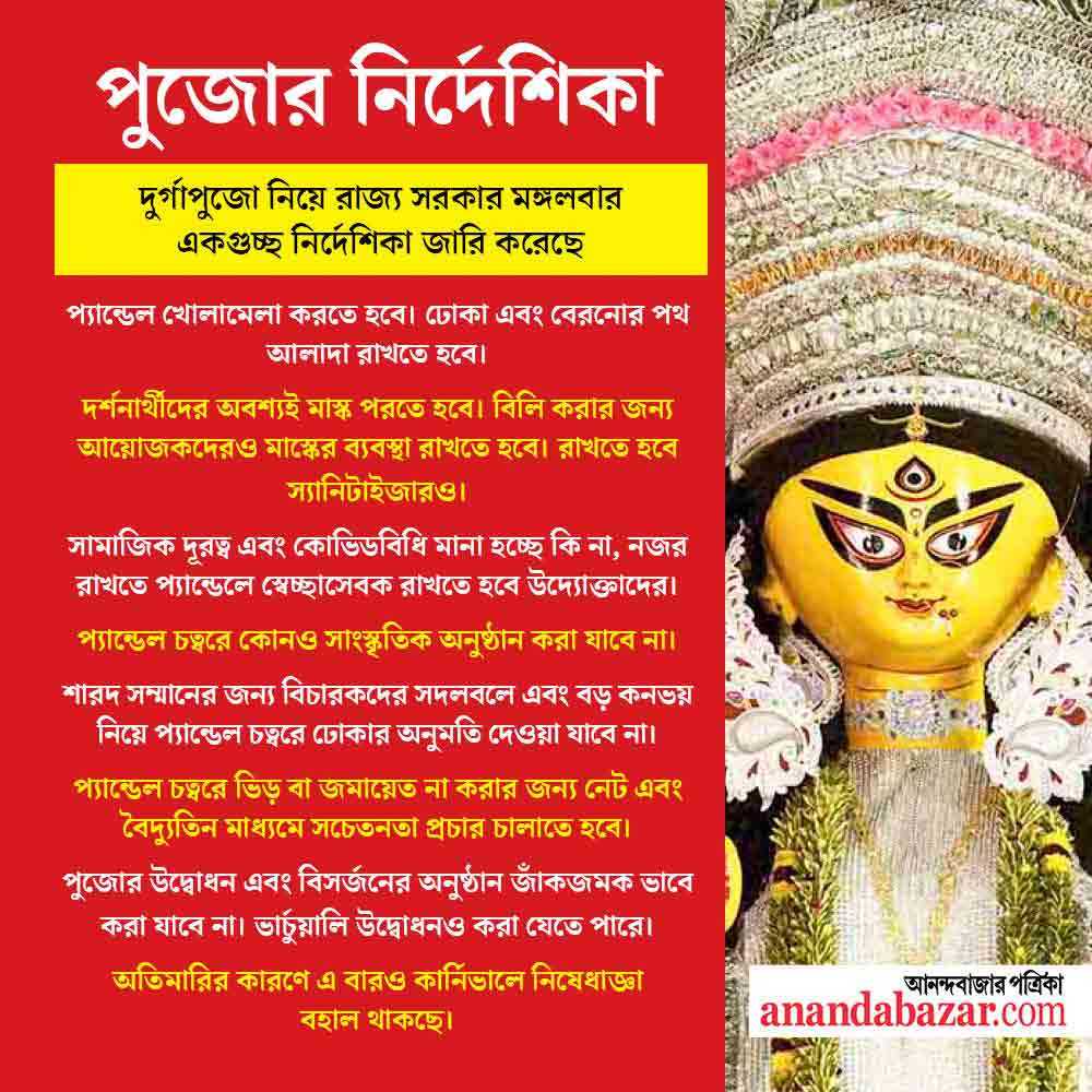 শুধু কার্নিভাল বাতিল নয়। মঙ্গলবার পুজো নিয়ে মুখ্যসচিব হরিকৃষ্ণ দ্বিবেদী নির্দেশিকায় আরও ১১টি বিষয় উল্লেখ করেছেন। পুজো কমিটিগুলিকে বলা হয়েছে - মণ্ডপ খোলামেলা রাখতে হবে। প্রবেশ এবং বেরোনোর পথ আলাদা থাকবে। মণ্ডপে আগত দর্শনার্থীদের অবশ্যই মাস্ক পরতে হবে। পুজো কমিটিগুলিকেও মাস্ক এবং স্যানিটাইজারের ব্যবস্থা করতে হবে। মণ্ডপে ঠিক মতো সামাজিক দূরত্ব ও করোনা বিধি মানা হচ্ছে কি না তা নজর রাখতে পর্যাপ্ত সংখ্যক স্বেচ্ছাসেবকের ব্যবস্থা করতে হবে পুজো কমিটিকে। এ ছাড়া বলা হয়েছে, সাংস্কৃতিক অনুষ্ঠান, পুজোর উদ্বোধন এবং বিসর্জনের অনুষ্ঠানে জাঁকজমক করা যাবে না।