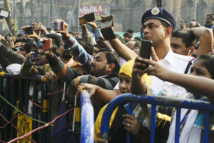 ধর্মতলায় ধর্নামঞ্চে ‘দিদি-দর্শনে’ আমজনতা। —নিজস্ব চিত্র।
