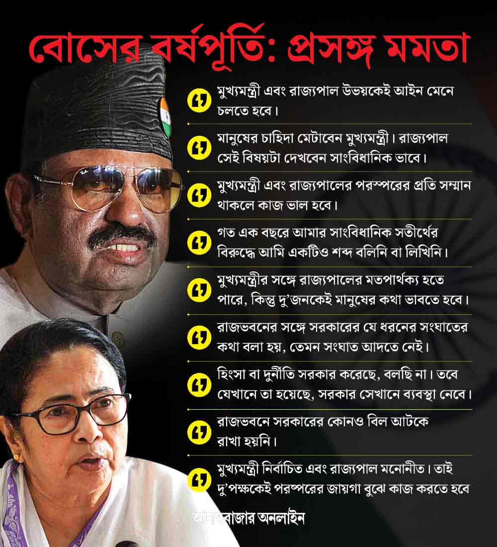মুখ্যমন্ত্রী মমতা বন্দ্যোপাধ্যায়ের রাজ্যে মঙ্গলবারই এক বছর পূর্ণ করলেন রাজ্যপাল বোস। সেই উপলক্ষে একটি সাংবাদিক সম্মেলনে ডেকেছিলেন রাজভবনে। সেখানেই বিগত এক বছরের অভিজ্ঞতার বর্ণনা দিতে গিয়ে বোসের কথায় উঠে আসে রাজ্য সরকার, শাসকদল এবং মুখ্যমন্ত্রী মমতা বন্দ্যোপাধ্যায়ের প্রসঙ্গ। আর উপস্থিত সবাইকে কিছুটা অবাক করে দিয়েই রাজ্যপাল বলেন, ‘‘রাজভবনের সঙ্গে সরকারের যে ধরনের সংঘাতের কথা বলা হয়, তেমন সংঘাত আদতে নেই।’’ একই সঙ্গে তাঁর সংযোজন, গত এক বছরে তিনি একটি শব্দও বলেননি বা লেখেননি তাঁর সাংবিধানিক সতীর্থ তথা রাজ্যের মুখ্যমন্ত্রীর বিরুদ্ধে।