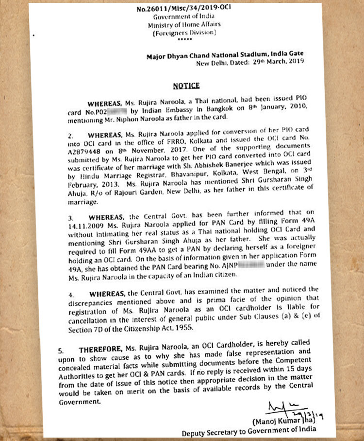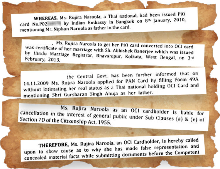 ওই নোটিসে জানানো হয়েছে, ২০১০ সালের ৮ জানুয়ারি ব্যঙ্ককের ভারতীয় দূতাবাস রুজিরা নারুলাকে পারসন অব ইন্ডিয়ান অরিজিন (পিআইও) কার্ড দেয়। ওই কার্ডের জন্য রুজিরার করা সেই আবেদনে তাঁর বাবার নাম দেওয়া ছিল নিফন নারুলা। কিন্তু মনোজ কুমার ঝায়ের ওই নোটিস অনুযায়ী, ২০১৭ সালে রুজিরা কলকাতার এফআরআরও অফিসে পিআইও কার্ড পরিবর্তন করে ওভারসিজ সিটিজেন অব ইন্ডিয়া (ওসিআই) স্ট্যাটাসের জন্য আবেদন করেন। সেই আবেদন মঞ্জুর করা হয়। সেখানে তিনি আবেদনের স্বপক্ষে ৩ ফেব্রুয়ারি ২০১৩ সালে হিন্দু ম্যারেজ অ্যাক্ট অনুযায়ী তাঁর বিয়ের রেজিস্ট্রেশন (নথিভুক্তিকরণ)-র নথি জমা দেন। ওই নোটিস অনুযায়ী, সেই নথিতে রুজিরার বাবার নাম গুরশরণ সিংহ আহুজা, ঠিকানা দিল্লির রাজৌরি গার্ডেনের।