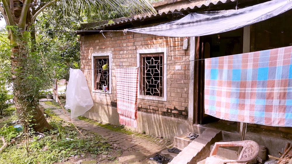 পলেস্তারা খসে যাওয়া ইট বের করা একতলা বাড়ি। রাস্তা থেকে ঢোকার মুখেই টিউবওয়েল। সেটাকে বাঁ দিকে রেখে, মুখের উপর ঝুলে পড়া পেয়ারা-আম গাছের ডাল সরিয়ে এগোলে চোখে পড়ে বাড়ির দেওয়াল। একতলা বাড়ির সামনের অ্যাসবেসটসে ঢাকা বারান্দা ইট দিয়ে ঘেরা।