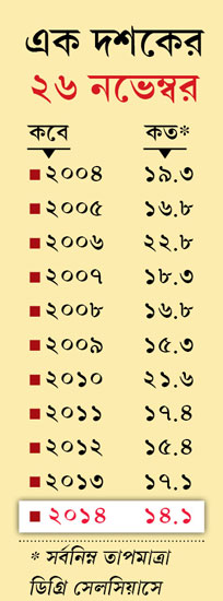 ২০১২ সালের ৩০ নভেম্বর কলকাতার তাপমাত্রা এক ধাক্কায় নেমে গিয়েছিল ১৪ ডিগ্রিতে। আচমকা ঠান্ডায় কার্যত জবুথবু হয়ে গিয়েছিলেন মহানগরীর বাসিন্দারা। গত এক দশকের হিসেবে সেটাই ছিল সবচেয়ে কম। এ দিকে, বুধবার সর্বনিম্ন তাপমাত্রা ছিল ১৪.১ ডিগ্রি সেলসিয়াস! যা কি না এক দশকের সর্বনিম্নের প্রায় সমানই বলা চলে। নভেম্বর শেষ হতে এখনও চার দিন বাকি। পারদ পতনের ধারা দেখে আবহবিদ্দের একাংশের অনুমান, এক দশকের রেকর্ড ভেঙে এ বার নতুন রেকর্ড গড়তে পারে নভেম্বর।