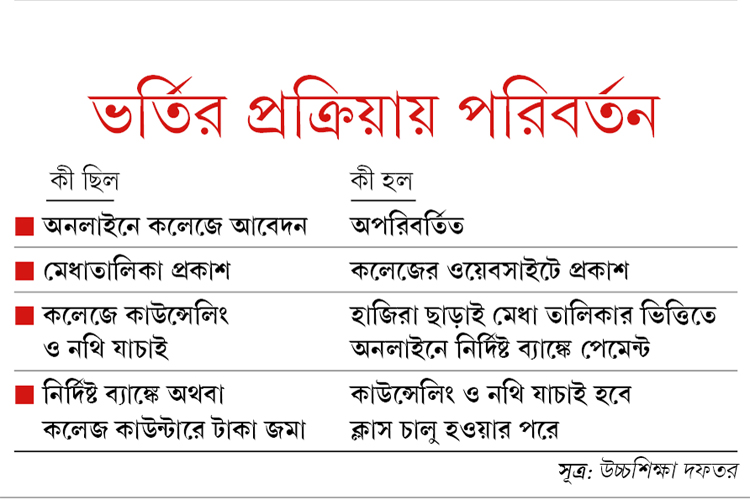বিজ্ঞপ্তিতে জানানো হয়েছে, মেধা তালিকার ভিত্তিতে ভর্তি নির্দিষ্ট হওয়ার পরে সংশ্লিষ্ট কলেজ যে ব্যাঙ্কে টাকা জমা দেওয়ার নির্দেশ দেবে সেখানে টাকা জমা দিলেই ভর্তি হওয়া যাবে। ক্লাস চালু হওয়ার পরে নথি যাচাই করা হবে। শিক্ষামন্ত্রী পার্থ চট্টোপাধ্যায় অবশ্য আগেই বলেছেন, নথি যাচাইয়ের সময় বড় কোনও গরমিল পেলে সংশ্লিষ্ট পড়ুয়ার ভর্তি বাতিলও হয়ে যেতে পারে।